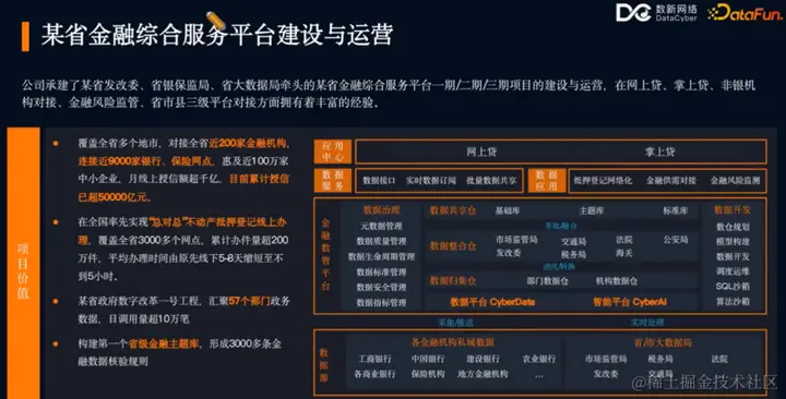第二个案例为某省金融综合服务平台的建设与运营。数新网络的云数据智能平台利用大数据和云计算技术,实现了多个政府部门和银行间数据的统一融合分析,解决了金融领域的数据使用问题。数新网络提供了数据平台 CyberData 和智能平台 CyberAI,帮助构建金融主题库和金融数仓,涵盖从数据开发、治理到 AI 任务开发的全流程。此外,为了确保数据的合法合规共享,数新网络还提供了数据沙箱和算法沙箱能力。最终,在业务层面,数新网络输出了适用于金融领域的数据应用,为金融综合服务平台提供了全面的数据智能解决方案。