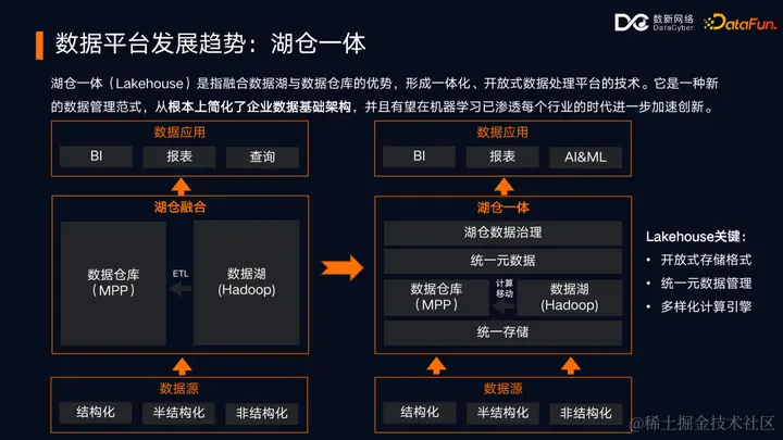 第二个重要趋势是湖仓一体,传统的湖仓融合架构虽然能够处理多种数据类型,但由于数据冗余存储和依赖 ETL 任务的数据搬运,存在数据时效性和一致性差的问题,同时增加了开发和运维的复杂性。
