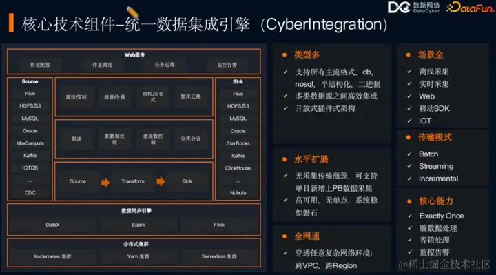 统一数据集成引擎 CyberIntegration 是一个多功能的数据同步平台。该平台支持三种主要的数据同步引擎:DataX、Spark 和 Flink。这些引擎能够处理包括批量同步、流式同步、全量同步、增量同步以及整库同步在内的多种数据同步需求。