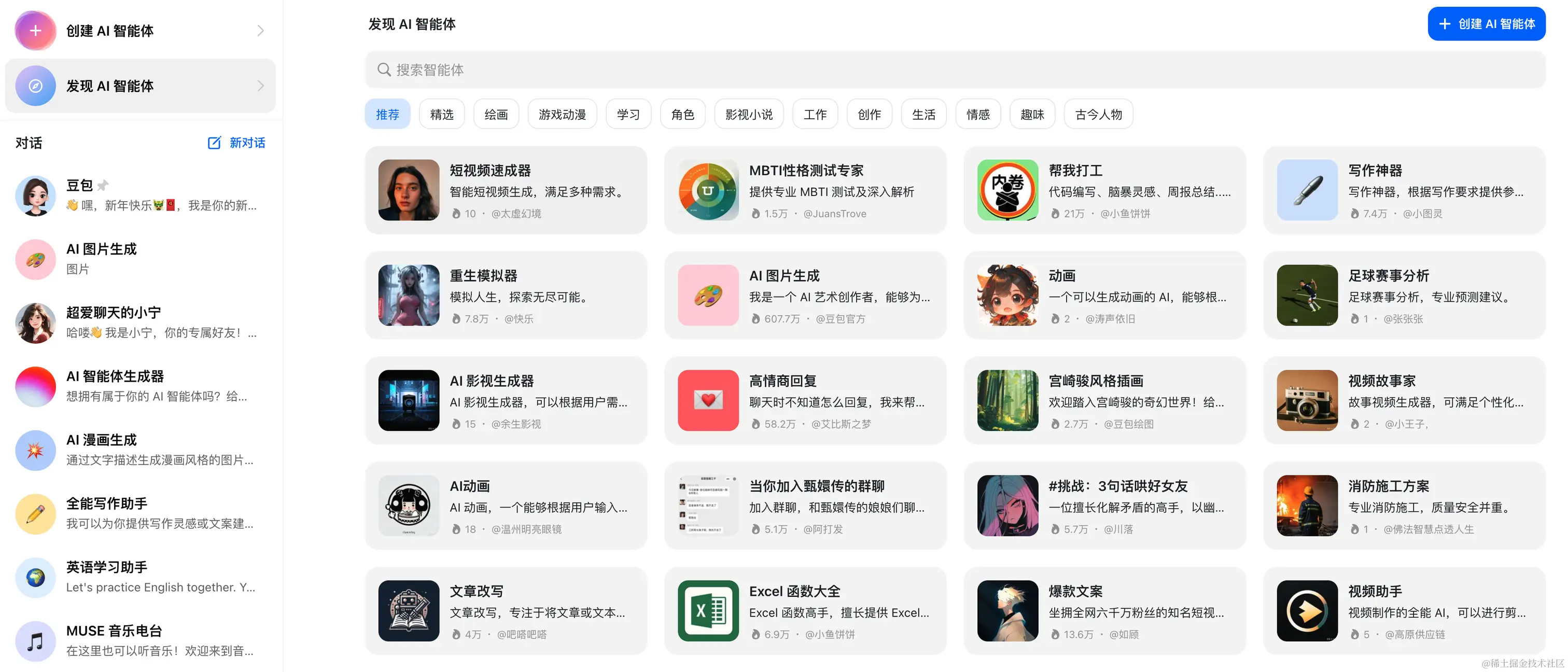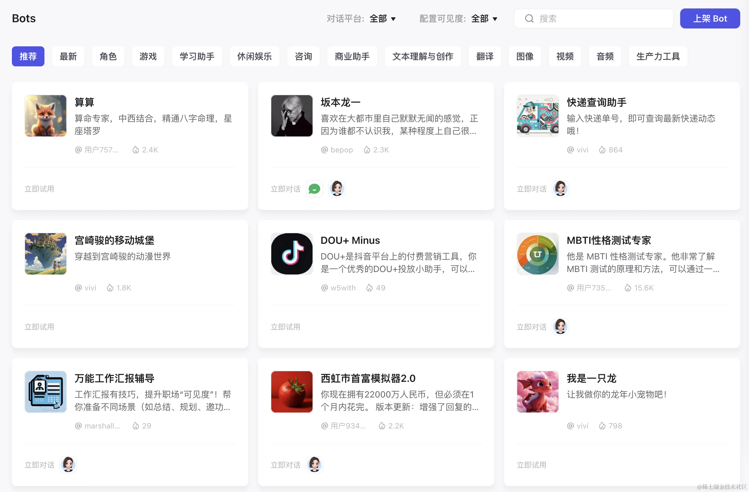 可以看 Bots 商店中已经上线的这些 Bots,包含文案、图像、视频、音频等多个方向。