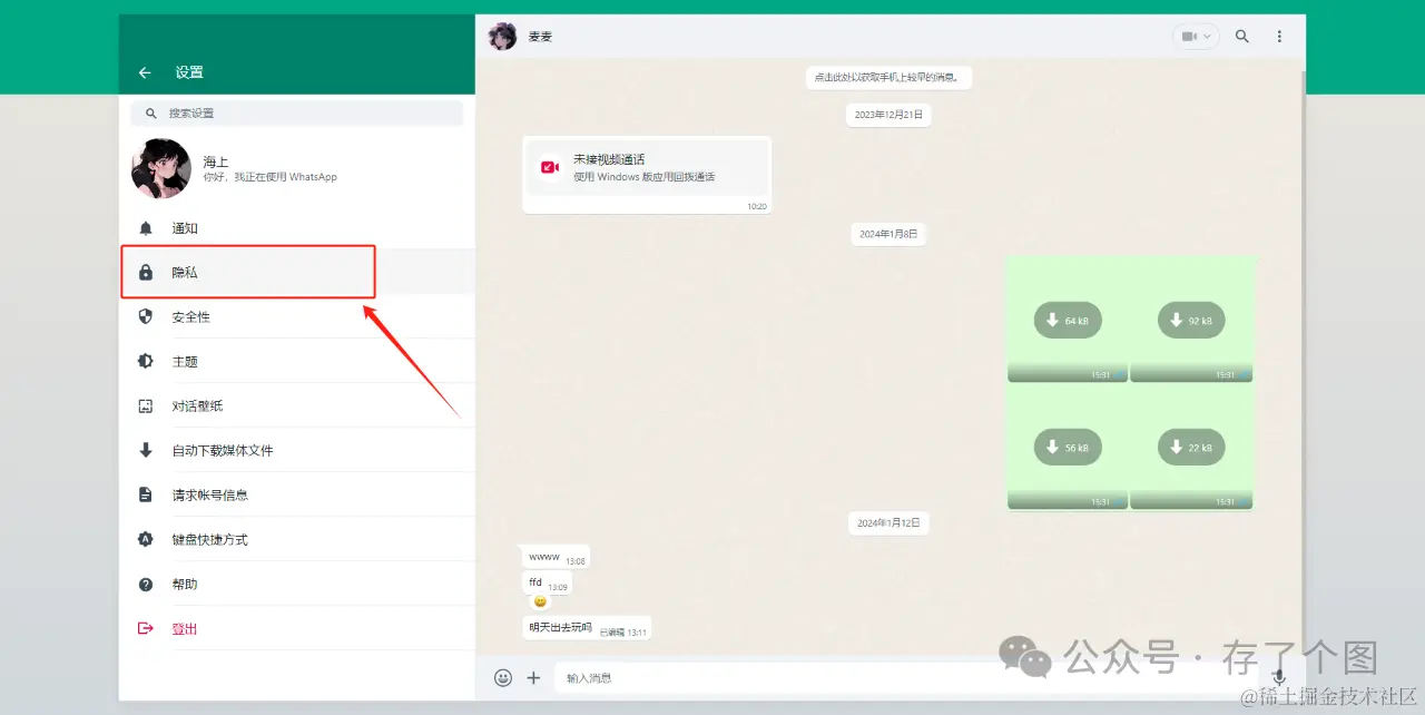 首先登录网页版WhatsApp,点击聊天列表右上角“三个点”图标后点击“设置”