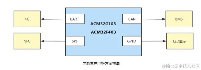 我们推出的两轮车充电桩解决方案是以ACM32F403RET7为主控芯片,该方案包含了电源模块、控制模块、显示模块、通讯模块等。ACM32F403主频高达180MHz,带两路CAN接口,可与BMS通信,读取电池相关信息,带四路高速QSPI接口,实现与NFC模块的高效通信,另外带串口、32bit timer、IO等丰富的外设资源,很好的满足了产品的功能需求,方案框图如下所示: