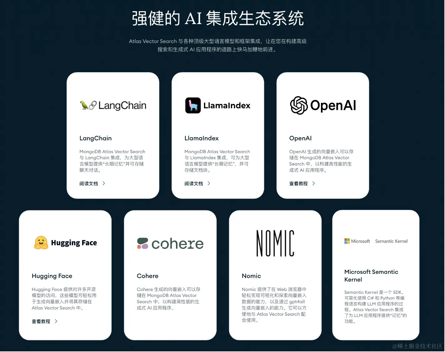 Atlas Vector Search 可以充分发挥数据的潜力,无论是结构化数据还是非结构化数据,随着人工智能和大型语言模型的普及和使用率不断攀升的势头,解决关键的业务挑战。之所以能够做到这一点,是因为 Vector Search 是 MongoDB Atlas 开发者数据平台的一部分,该平台从我们灵活的文档数据模型和统一的应用程序接口开始,提供一致的体验。为了确保您从 Atlas Vector Search 中获得最大价值,我们建立了一个强大的人工智能集成生态系统,允许开发者使用他们最喜欢的大型语言模型或框架进行构建。