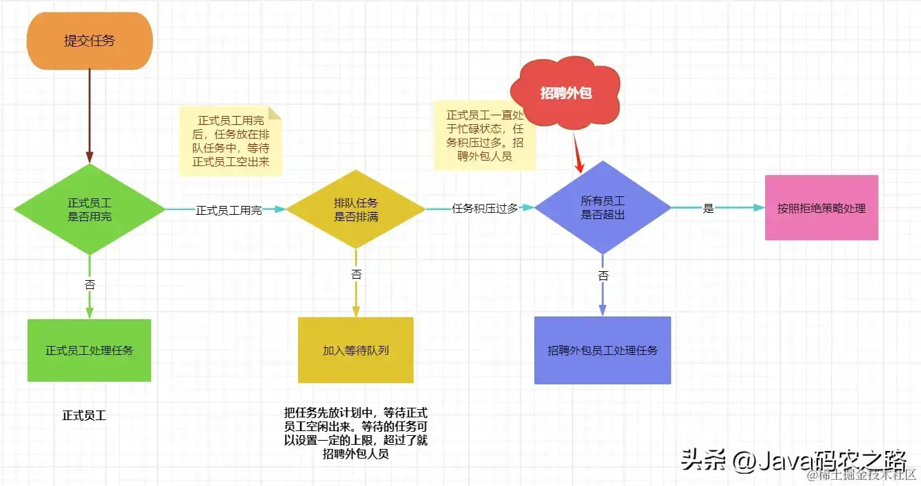 外包员工:这些是公司根据业务需求临时雇佣的员工,他们只在有额外的任务时才会被雇佣,如果没有任务,他们会被解雇或者辞职。他们也可以负责处理公司的业务,比如活动、项目、临时需求等。在Java线程池中,外包员工对应于非核心线程(maximumPoolSize - corePoolSize),这些线程只在核心线程不足以处理所有任务时才会被创建,他们也负责执行线程池中的任务,如果没有任务,他们会等待新的任务到来。