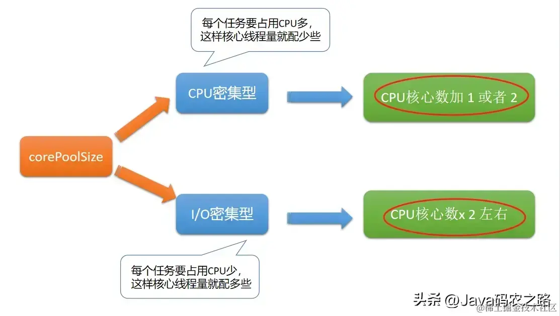 - 对于 CPU 密集型任务,应该将核心线程数设置为处理器核心数加 1 或者 2;