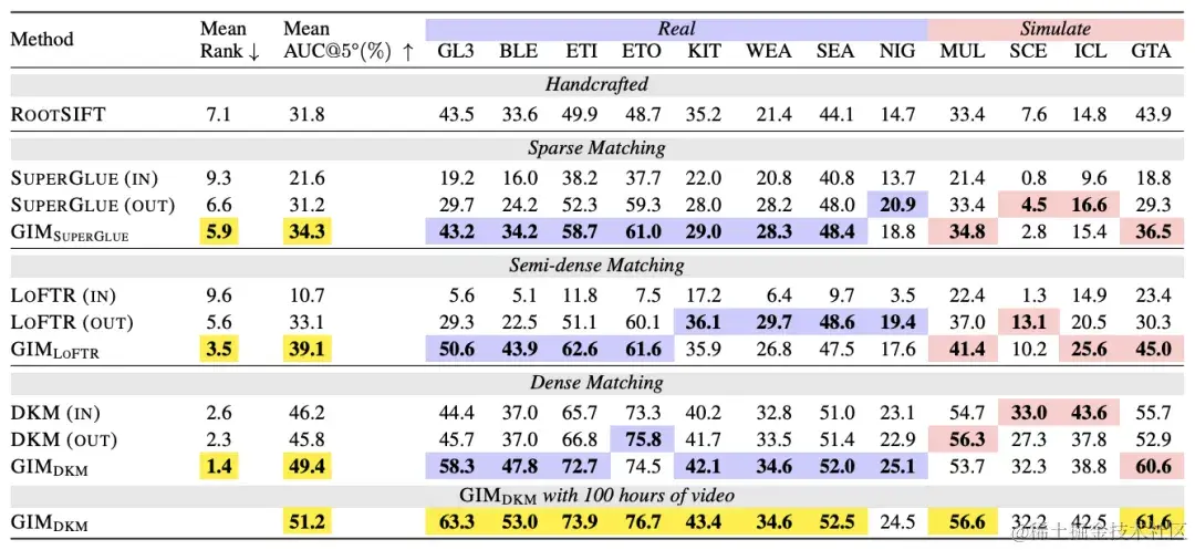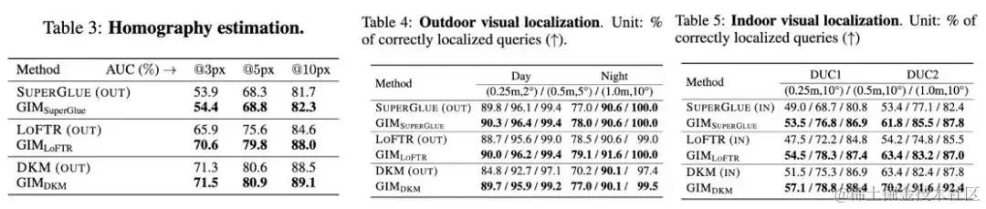 _图 4. 匹配模型泛化性能评估结果_从图 4 可以看到,GIM 可以明显地提升匹配模型的泛化性能。在被 GIM 训练前,SuperGlue 和 LoFTR 在 GL3、BLE 和 GTA 序列中甚至不如传统算法 RootSIFT。在被 GIM 训练后,这两个模型的泛化性能都得到了极大的提升。正如刚才所说,50 小时的视频数据还远未让模型的性能达到极限。按照作者最新的 100 小时视频数据训练结果,性能已经可以达到 51.2,远超现有的模型。如图 5 所示,匹配模型的泛化性能提升,同样会为下游任务带来增益。值得注意的是,在图 5 的重定位任务中,GIM 都是仅以一个模型和其他特定场景的模型进行对比,但依然能取得更好的结果。