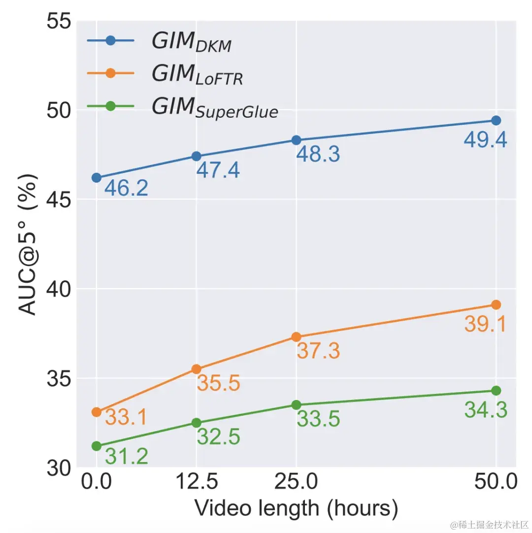 _图 1. 部分互联网视频包含的多样场景_GIM 框架适用于训练所有匹配模型。如图 2 所示,三个匹配模型 DKM、LoFTR 和 SuperGlue 分别对应了:密集匹配、半密集匹配和稀疏匹配这三种主流匹配范式。在 GIM 框架下,用于训练的视频时长越长,匹配模型的性能就会越高。从目前的折线来看,在使用 50 小时的视频后,性能还没有表现出饱和的现象,因此如果使用更多的视频,性能还会进一步提高。