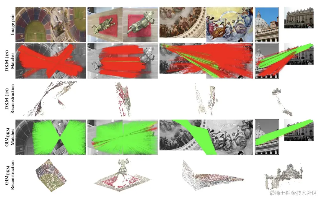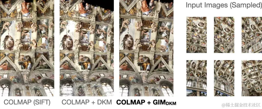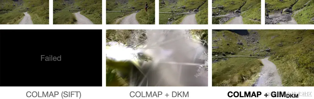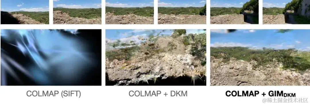 _图 8. 不同匹配模型对多视图重建的影响。第一行是部分重建图像的展示。第二行是重建的结果展示。读者感兴趣可以去论文主页和介绍视频中观看动态可交互的结果。_由于 GIM 能够有效提升 COLMAP 多视角重建的质量,因此,GIM 也能为对应的下游任务中「增光添彩」,下面几张图展示了用 GIM 的 COLMAP 结果来初始化 Gaussian Splatting 的效果。可以看到在一些有挑战性的场景中,基于 SIFT 和 DKM 的 COLMAP 都不能够很好地提供有效的 initialization,导致渲染效果不佳。
