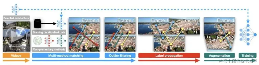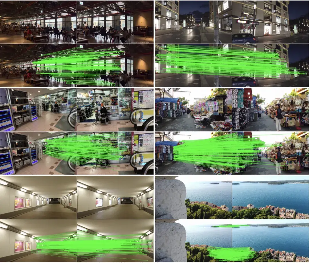 _图 10.GIM 框架_GIM 框架的方法很简洁,方法的核心在于利用视频中帧和帧之间的连续性,将匹配从短距离的帧传递到长距离的帧上,以此获取宽基线的训练图像。第一步,准备一个用于训练的匹配模型和互联网视频。第二步,用标准训练数据(非互联网视频,如 MegaDepth)训练匹配模型,然后再收集其他补充的匹配方法,用所有这些方法在互联网视频上的短距离间隔的帧上进行匹配,获取较为密集的匹配结果。再用 outlier filtering 过滤一遍匹配。第三步,利用视频的时序关系,将匹配传递到更远的帧上,得到重合度较低和基线较宽的训练图像对。最后,对传递后的图像对及其匹配标签进行数据增强并进行训练。下图是 GIM 在互联网视频上生成的匹配标签可视化。这仅仅是极小的一部分,用于训练的数据的多样性远远多于作者能展示出来的图片。