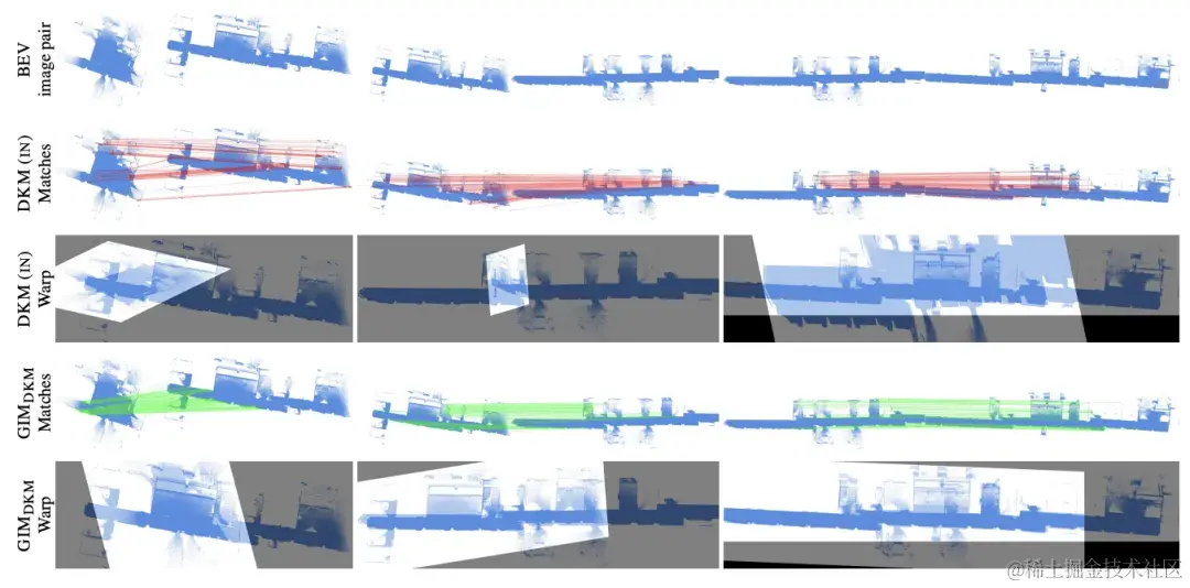 _图 6. 匹配模型在双视图匹配下的可视化结果_除此之外,如图 7 所示,GIM 模型强大的泛化性能还可以处理训练中从未见过的点云鸟瞰图匹配任务。