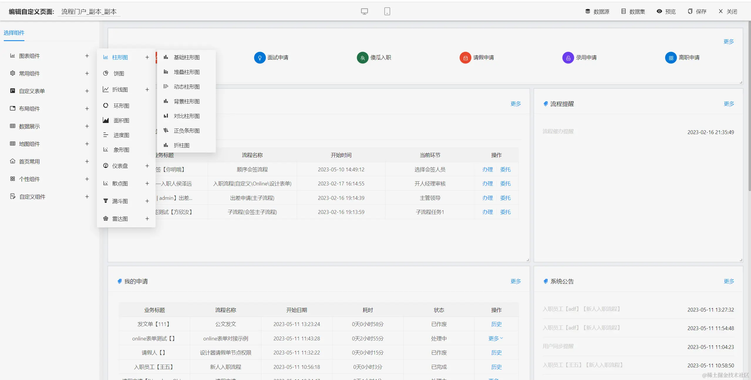 - 支持 ECharts,目前支持28种图表,在线拖拽设计,支持SQL和API两种数据源