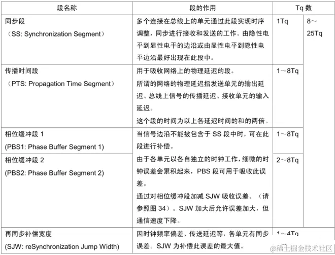 1 位由多少个 Tq 构成、每个段又由多少个 Tq 构成等,可以任意设定位时序。通过设定位时序,多个单元可同时采样,也可任意设定采样点。各段的作用和Tq 数如下图: