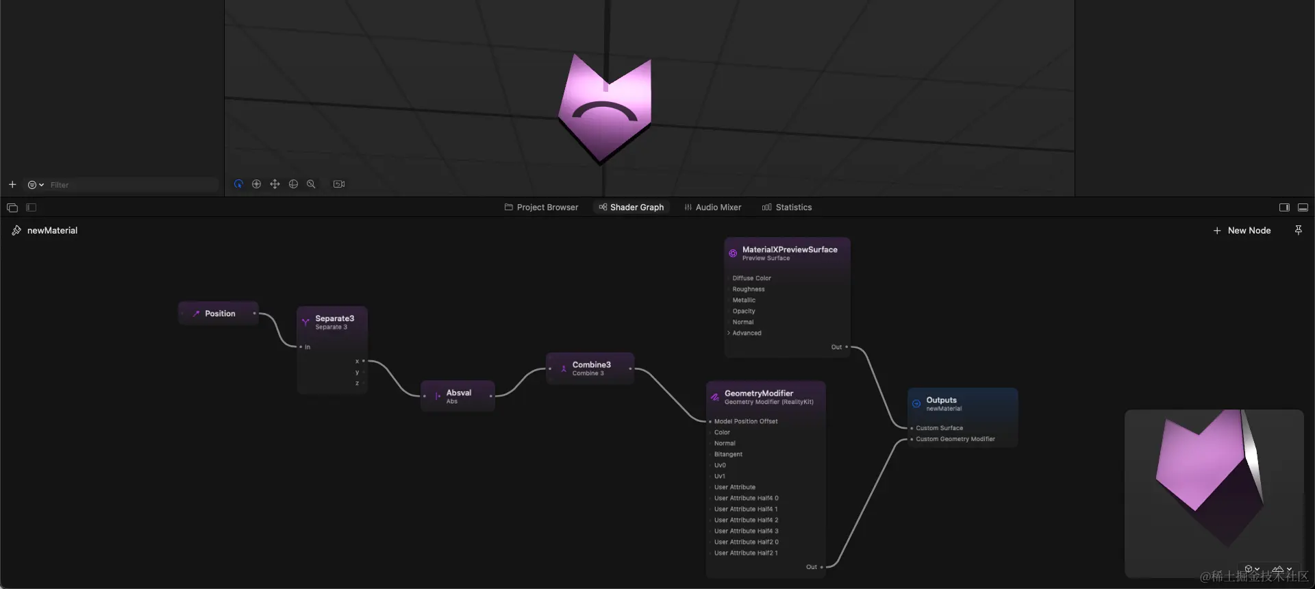 visionOS 上原生支持 ShaderGraph 方式来导入使用 Shader,然而目前 Xcode 本身暂未提供代码编写功能。也就是说,目前要使用 ShaderGraph 只能是使用外部工具(比如 Reality Composer Pro 或 Blender、MaYa)通过拖拽组件的方式提前编写好,再通过 USDZ 文件导入才能使用。