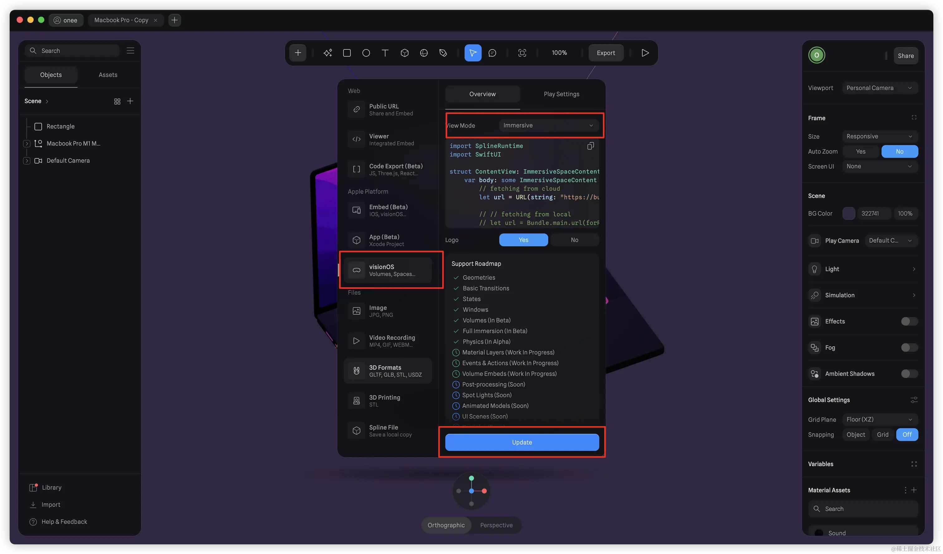 现在,SplineMirror + Apple Vision Pro 就可以满足你。当你在 Spline Editor 中编辑完场景后,只要点击 Export -> visionOS -> Update,就可以将这个场景文件导出为适合 visionOS 预览的形式。