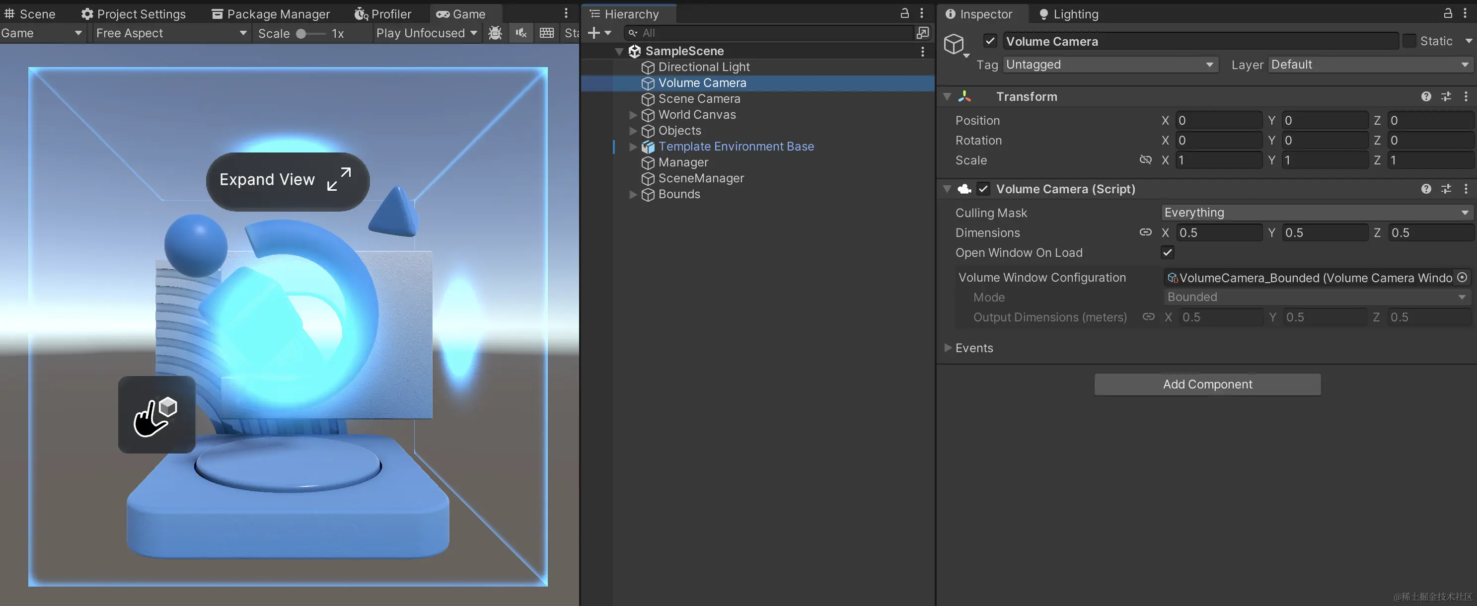 在 visionOS 原生开发中,我们一般用一个 Volumetric Window 来包含 App 在 Shared Space 模式下的 3D 内容。在 PolySpatial 中,我们通过 VolumeCamera 组件实现相同的效果。就像原生开发中的 Volumetric Window 一样,我们也可以在 VolumeCamera 中通过 Dimensions 参数设置 3D Volume 在 MR 中的物理大小。当我们把 VolumeCamera 的模式设为 Bounded 的时候,顾名思义,我们的 3D 内容会被显示在一个大小固定的 Volume 中。当我们把 VolumeCamera 的模式改为 Unbounded,App 将从 Shared Space 模式切换到 Full Space 模式,App 中的 3D 内容也不再是有边界,进入全沉浸模式。