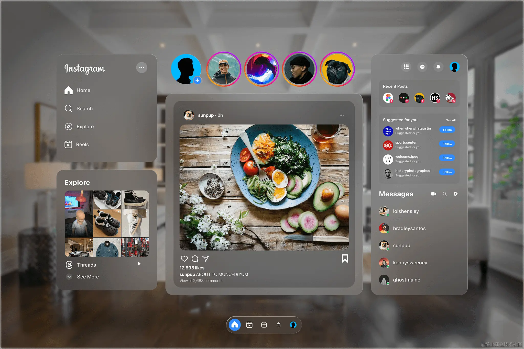本期封面,我们分享的是 Mike Stang 所创作的 Instagram 4 VisionOS,目前我们见到的很多 Apple Vision Pro 上的应用的 2D 窗口还是沿袭着类似 iPad 上,只有一个区块的设计,并没有充分利用好 “空间” 这块更大的 “屏幕”,希望未来我们能看到更多的类似 Instagram 4 VisionOS 这样的多区块设计的 App。