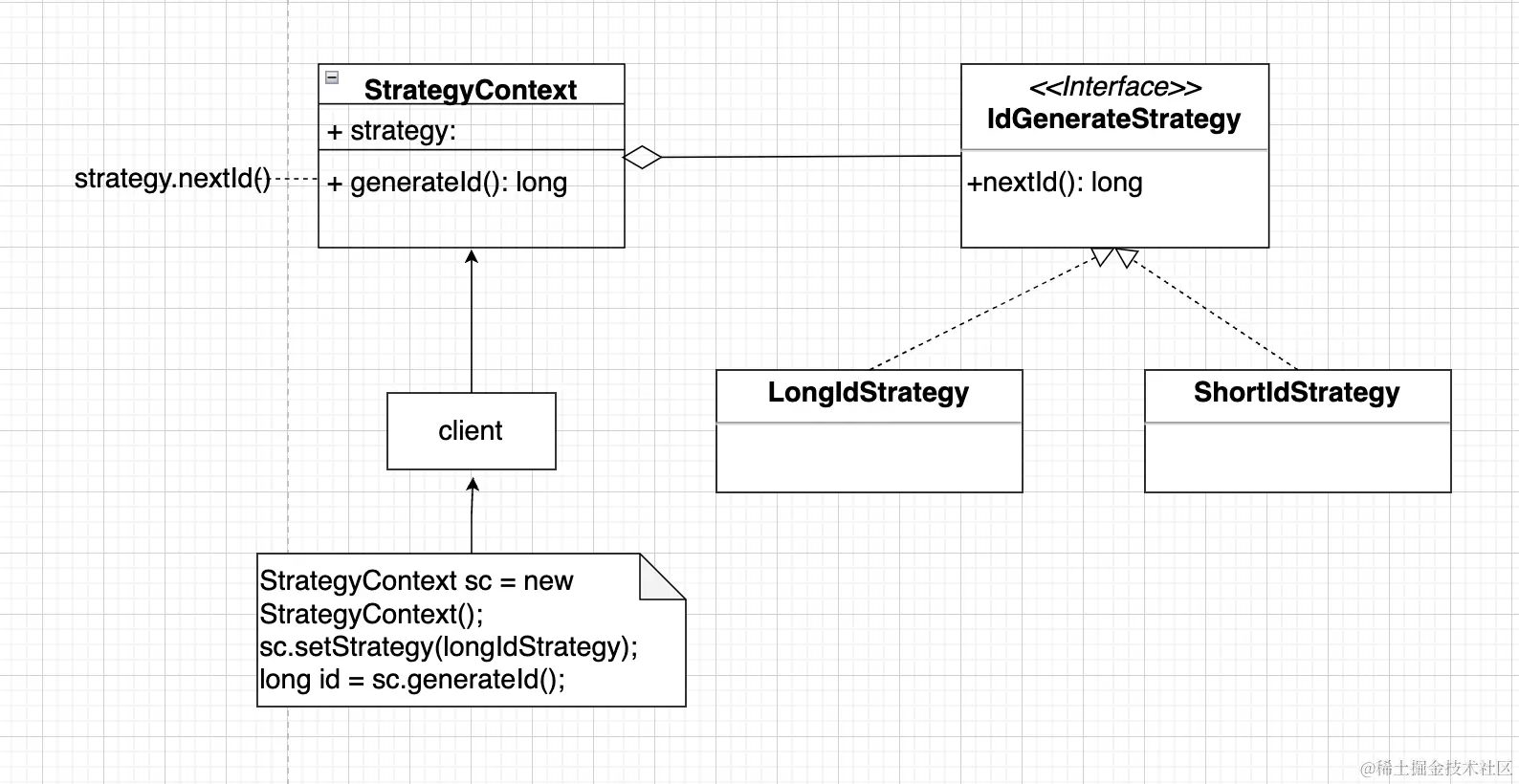 - 在一个称之为上下文的类中保留其策略类的引用,用于替换不同类型的实现。上下文并不执行,而是将其委托给其具体实现类执行。