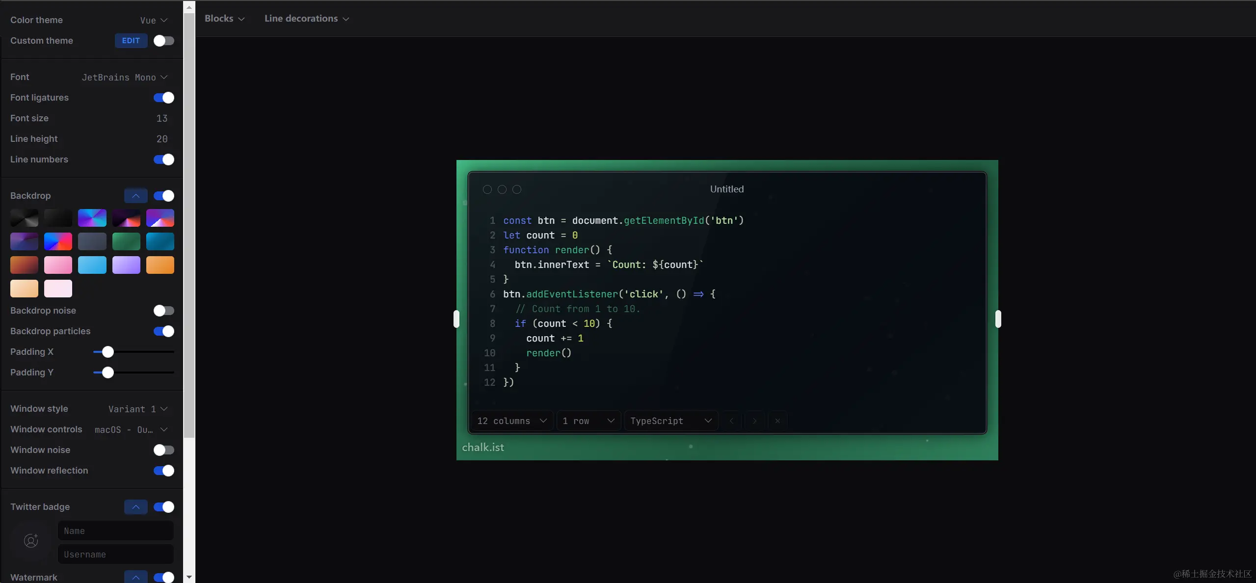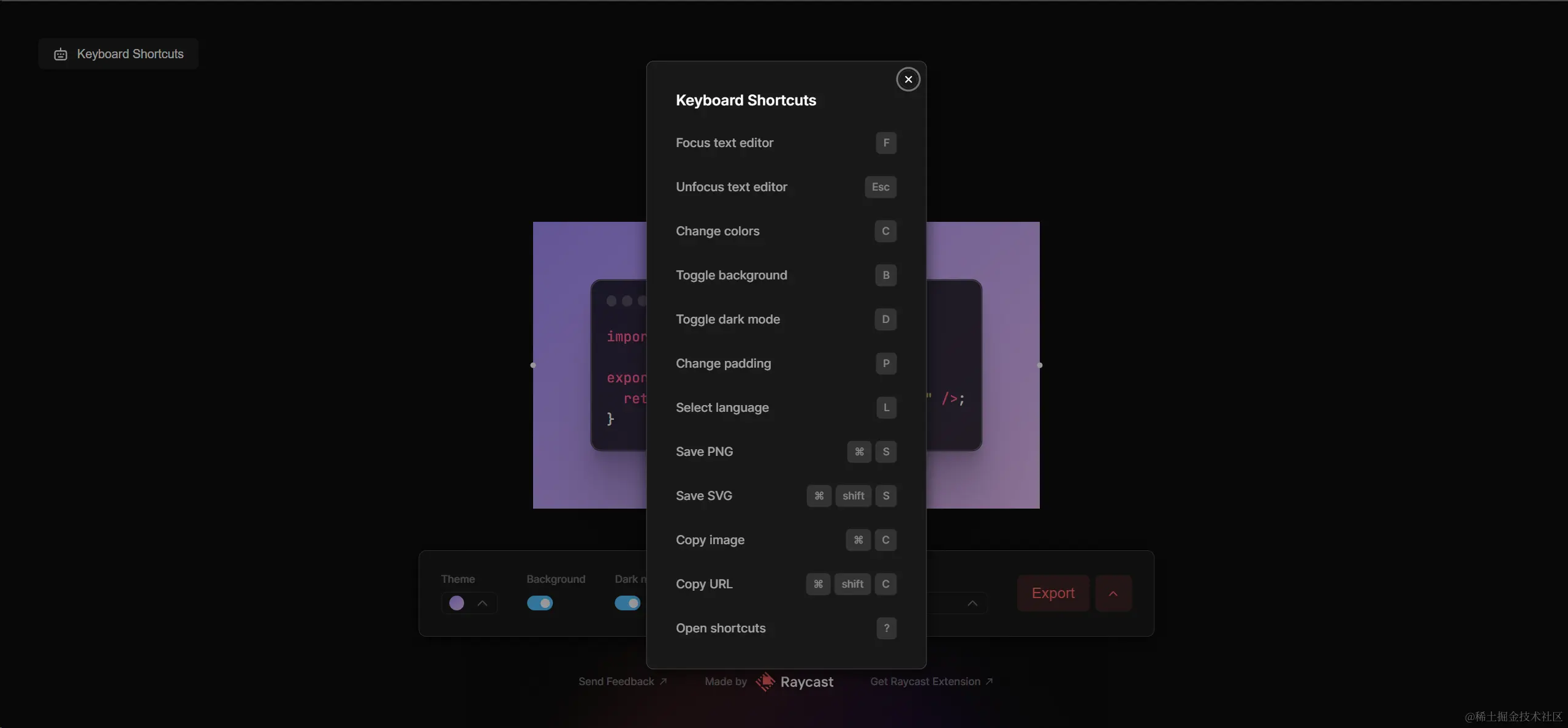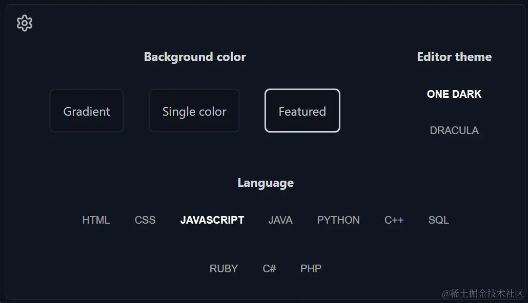 可以生成漂亮的代码截图,主题、背景、编程语言都可以调整,不仅可以生成图片,还可以生成分享链接。
