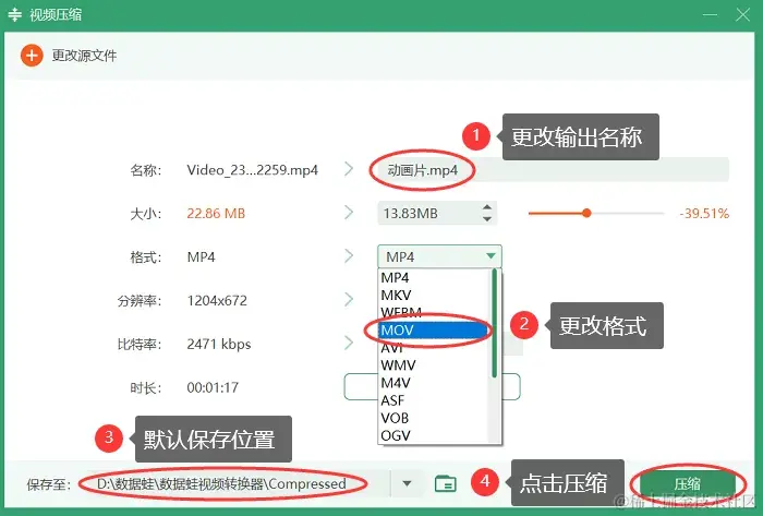 Step 3:我们还可以更改压缩视频的名称、格式、保存位置等。设置无误后,点击 【压缩】 按钮,软件将开始进行无损压缩。