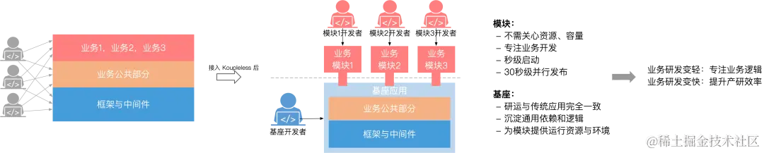 核心方式是通过类隔离和热部署技术,将应用从代码结构和开发者阵型拆分为两个层次:业务模块和基座,基座为业务模块提供计算环境并屏蔽基础设施,模块开发者不感知机器、容量、中间件等基础设施,专注于业务研发帮助业务快速向前发展。