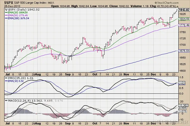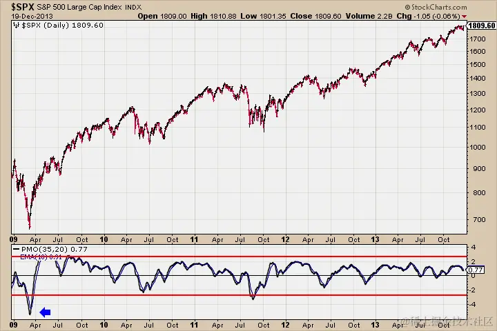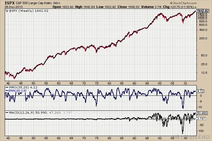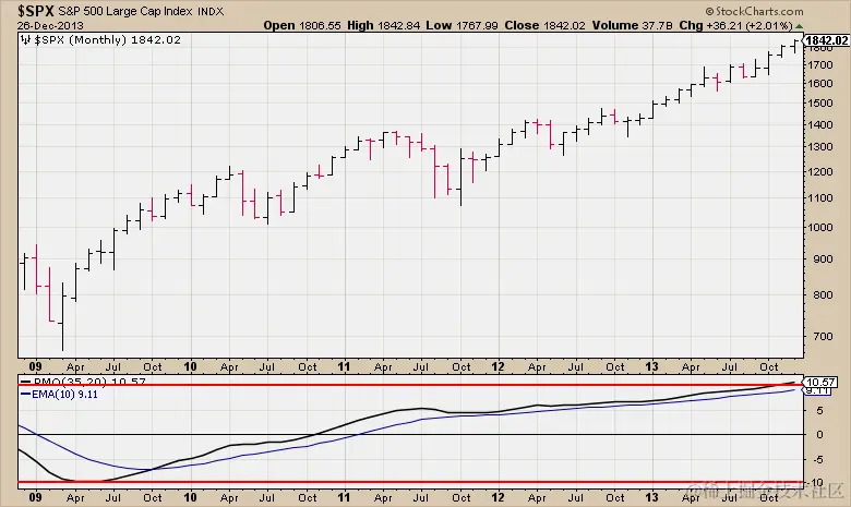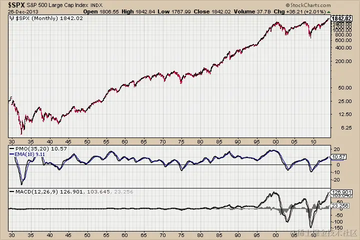 尽管在短期图表上,PMO 和 MACD 的形状相似,但是在长期图表上,PMO 的比率型计算的优势是显而易见的,因为 PMO 相对稳定,不像 MACD。请参见下面的周度和月度图表。