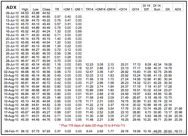 INTC 列显示了英特尔在 20 天内的价格,底部显示了平均值。