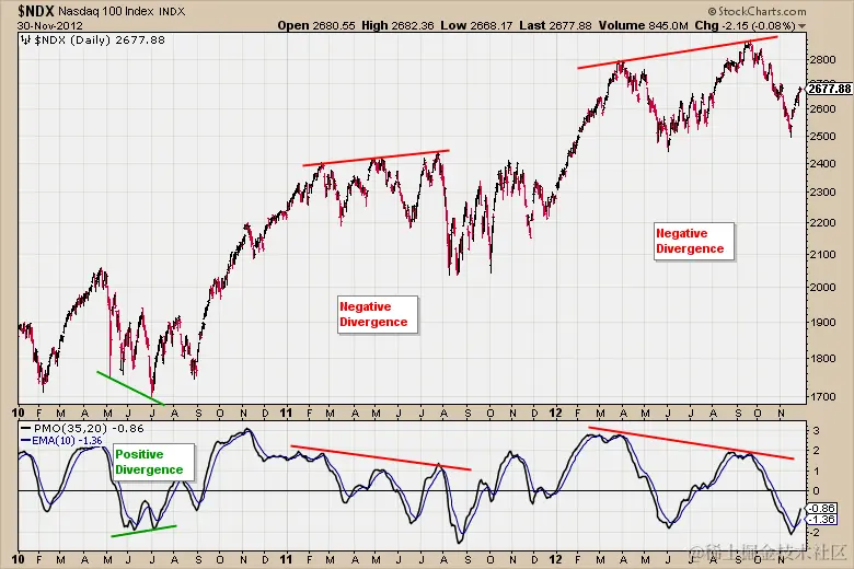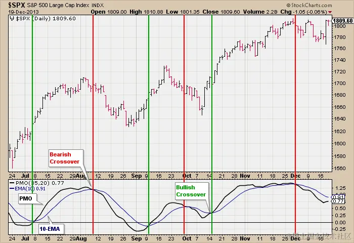 最后,与其他振荡器一样,PMO 通过形成与价格指数的背离来提示重要方向变化的迹象。下面突出显示了三个独立的背离。两个负面背离(红线)警告着重要的顶部,因为价格指数创造了一个更高的高点,而 PMO 创造了一个更低的高点。正面背离(绿线)信号着重要的底部,价格创造了一个更低的低点,而 PMO 创造了一个更高的低点。