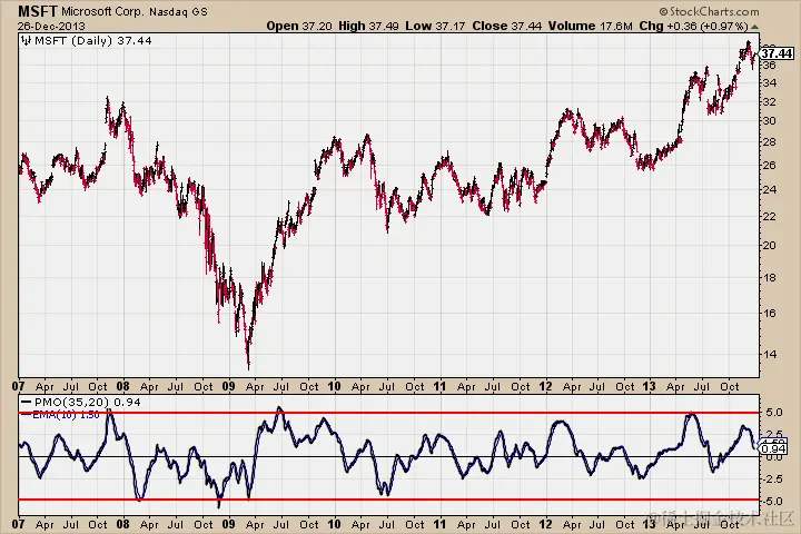 此外,请记住,技术指标是根据在所讨论的时间范围内的特定时间段计算的,因此月度 PMO 看起来完全不同于日常 PMO。请参见下面基于相同七年期间的月度图表,该图表与上面的日常 MSFT 图表相同。