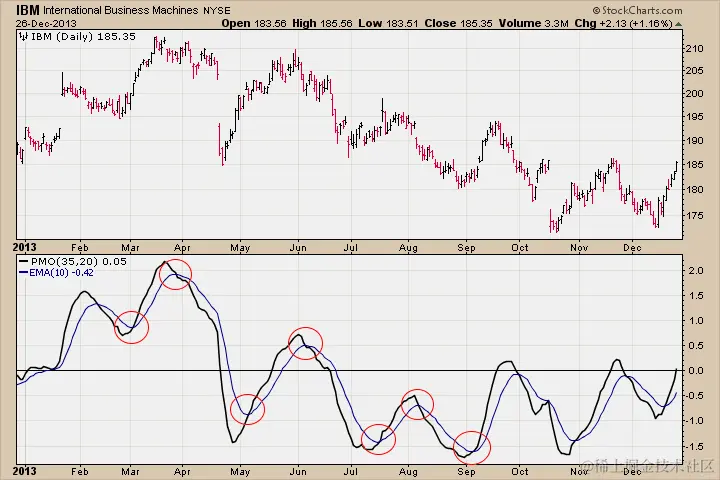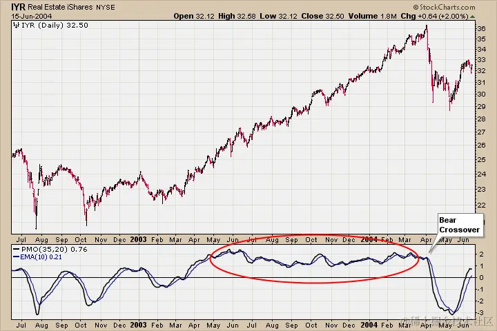 以下图表展示了一个常见的 PMO 形态,强调了为什么所有 PMO 交叉信号不能被字面接受。红色圈出的区域是在价格稳步上涨趋势中典型的 PMO 运动。价格波动很小,所以 PMO 横向移动。PMO 保持在零线以上的事实证明了价格走势的强劲;然而,价格波动中的小波动导致 PMO 在其 10-EMA 上下震荡,产生许多无利润的交叉牛市信号。这张图还展示了横向摆动最终会结束以及如何提供微妙线索表明趋势即将结束。