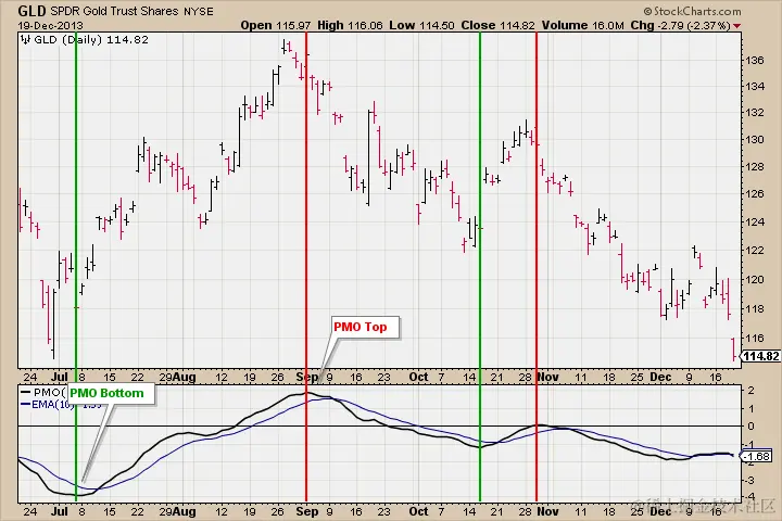 作为动量指标,PMO 表达价格运动的方向和速度。在这方面,它类似于其他动量指标。在下面的黄金 ETF(GLD)图表中,任一方向上最强烈的移动都以直线、陡峭、平滑的 PMO 运动为特征。更为停滞的趋势通常伴随着频繁的 PMO 方向变化。PMO 的底部和顶部表明价格动量已经转向,因此它们可以提供价格顶部和底部的早期信号。当 PMO 处于超买或超卖区域时,它们通常更可靠。