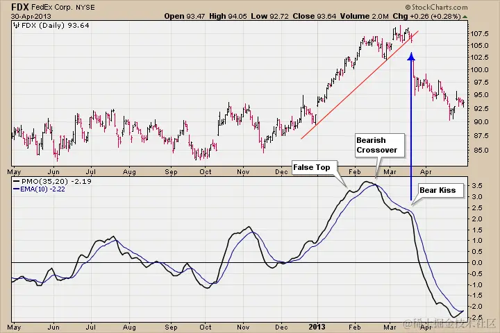 “熊市之吻”是 PMO 经常显示的三个明显顶部动作中的最后一部分。当我们看到这种经典形态时,它提供了额外的保证,表明可交易的顶部已经形成。当 PMO 相对超买且价格指数经历了大幅上涨时,我们开始寻找这种形态。这种形态并不总是出现在顶部,但是当出现时,它有助于增强我们对信号可靠性的信心。