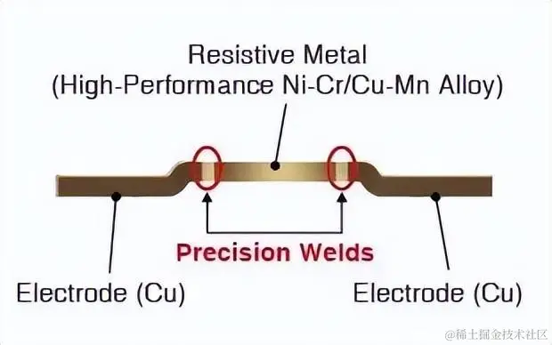 第二种方式是使用金属合金作为电阻结构,将其直接焊接到接触电极上。合金配方对于确定阻值及其热特性至关重要。这种电阻结构具有出色的功率和热性能表现,但其制造成本较高。下图给出了一个示例。