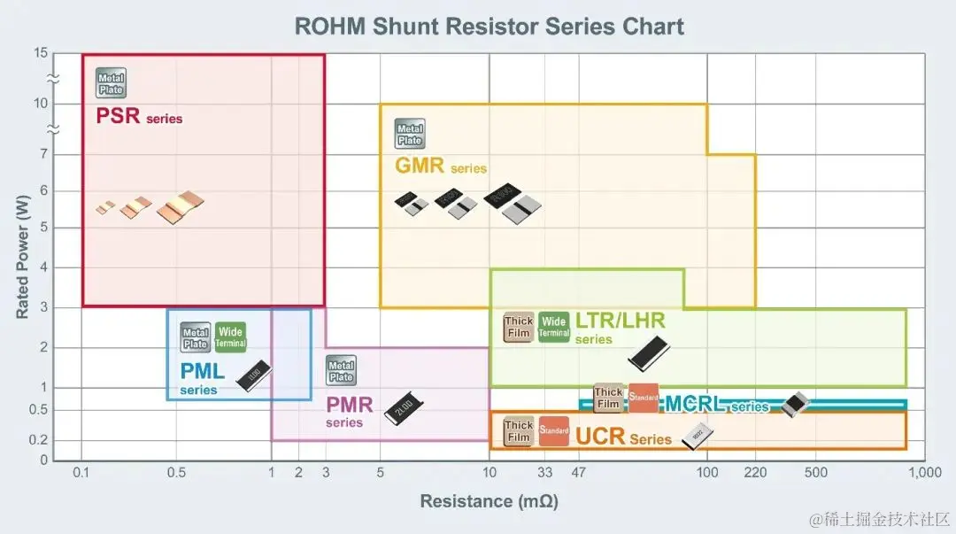 ROHM提供了丰富的产品阵容,可以满足各种应用对额定功率和电阻值等性能变量的不同需求。下图展示了ROHM的各系列分流电阻器及其性能范围。