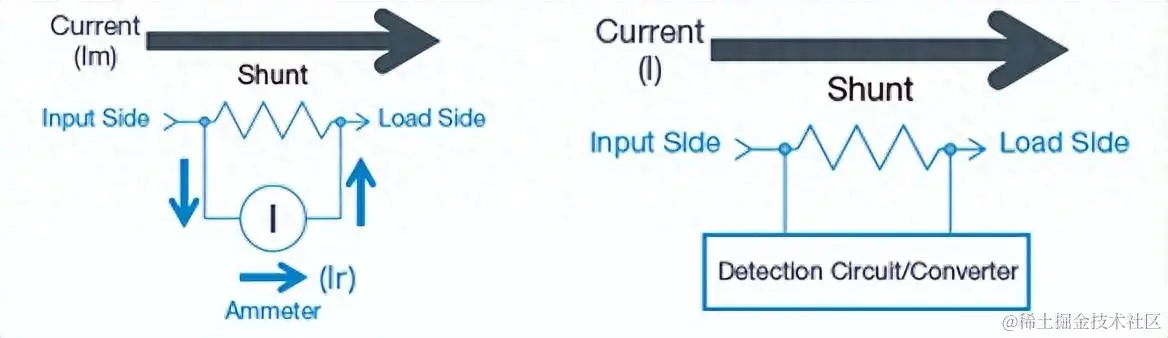 电路中的电流检测技术多种多样。其中最简单和最常见的方法之一是使用专用的检流电阻器。如下图所示,这种电阻器有两种用法。其一是图左侧的分流配置,其中大部分电流流经检流电阻器,而已知比例的电流流经电流表。该比例是已知电流表电阻和已知分流电阻的比例函数,因此可以计算出电路中的总电流。其二是图右侧的串联感测拓扑结构,其中所有电流都流经阻值较低的检流电阻器,再用高阻抗万用表测量其两端的电压。这样,电路中的总电流就可以运用欧姆定律轻松计算出来。