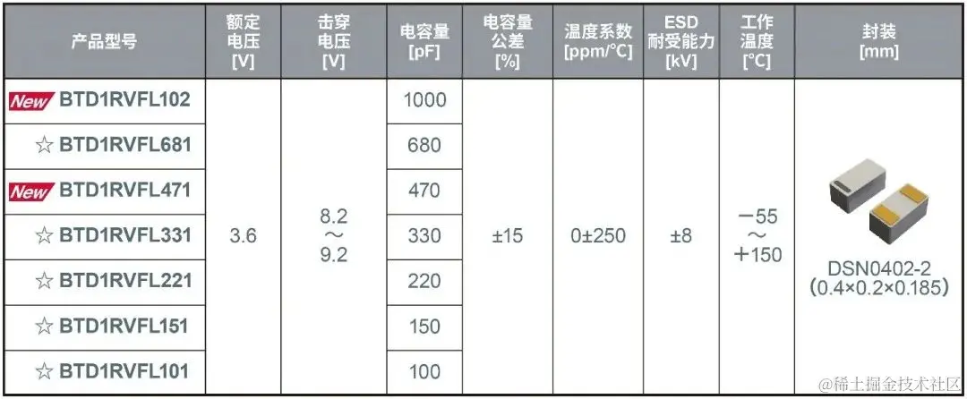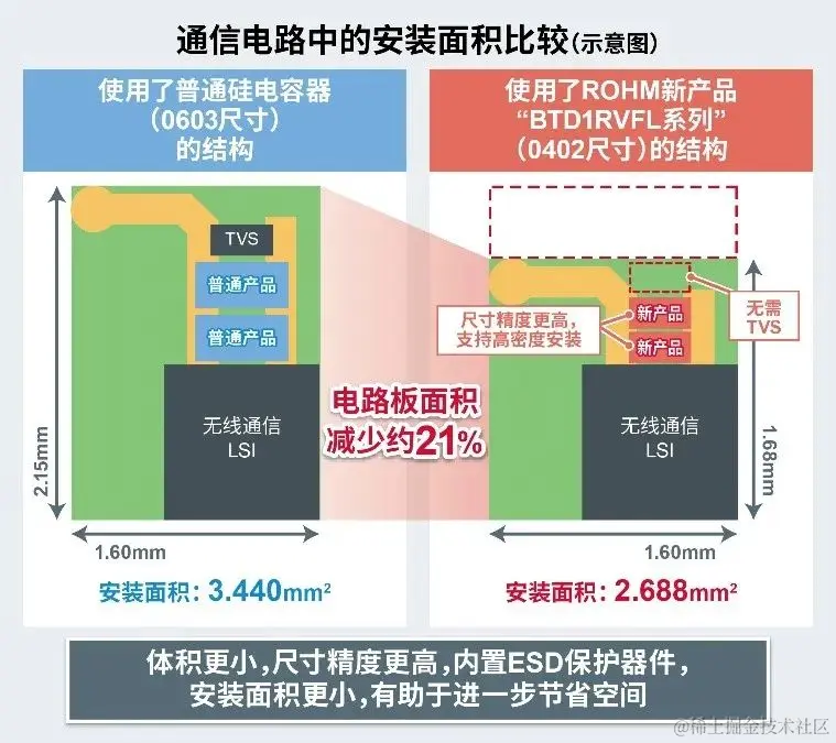 第一波产品“BTD1RVFL系列”的尺寸仅为0402(0.4mm×0.2mm),是业界超小尺寸的表面贴装型量产硅电容器。与0603尺寸的普通产品相比,其安装面积减小约55%,仅为0.08mm2,非常有助于应用产品的小型化。另外,新产品还内置TVS保护器件,可确保出色的ESD*2耐受能力,减少浪涌对策等电路设计工时。