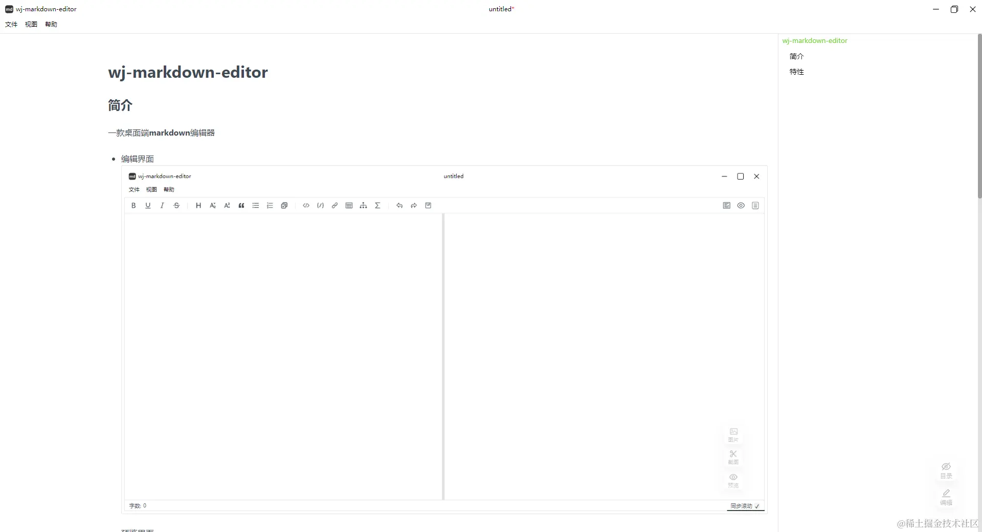 一款开源桌面端markdown编辑器 已注销 2024-03-07 250 阅读1分钟 wj-markdown-editor 源码地址 下载地址 更新记录 v0.0.3 新增:多标签页 后续版本会增加webdav同步功能 简介 一款开源桌面端markdown编辑器 编辑界面 预览界面 设置界面 特性 支持图片粘贴上传、截图上传等,细粒度控制图片保存方式 图片预览支持放大、旋转等 主题切换 自动保存 自定义预览宽度 目录提取 导出为PDF