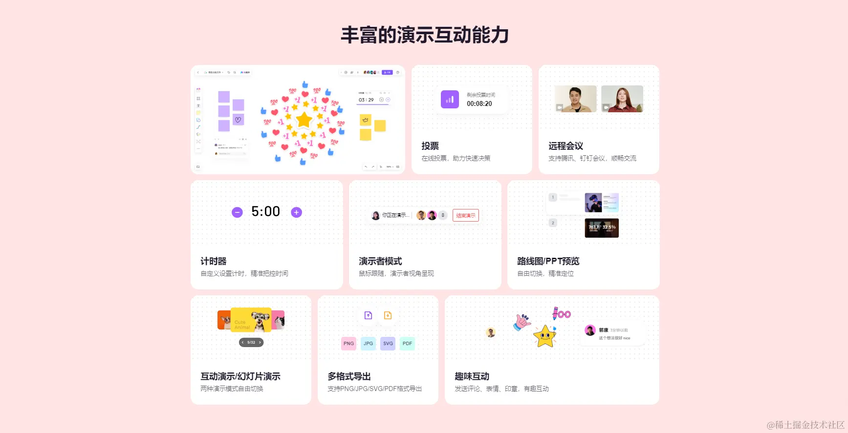 - 在线研讨会和头脑风暴:支持在线投票、计时器等功能,适合进行远程会议和团队创意讨论。