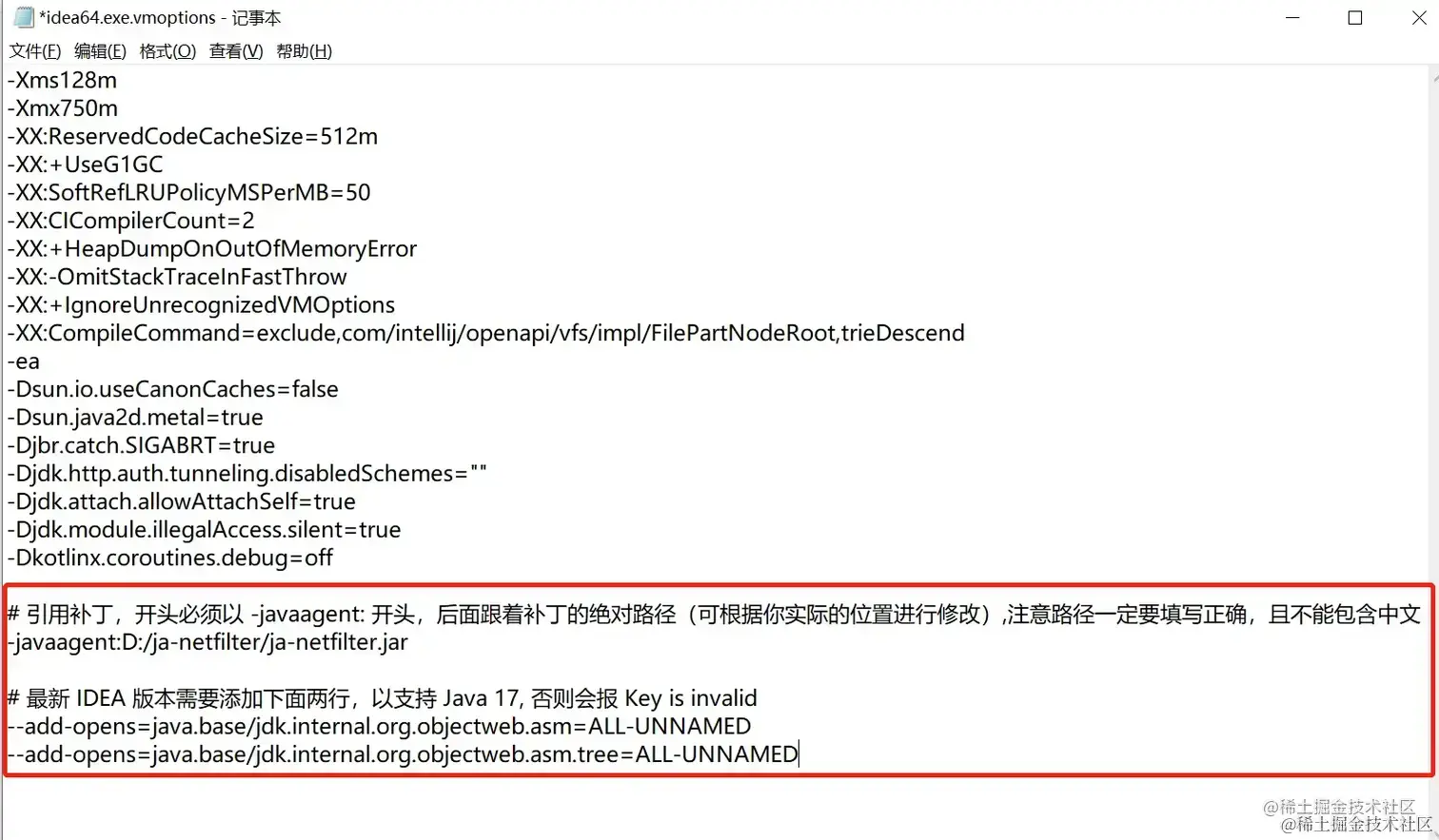 # 最新 IDEA 版本需要添加下面两行,以支持 Java 17, 否则会报 Key is invalid--add-opens=java.base/jdk.internal.org.objectweb.asm=ALL-UNNAMED --add-opens=java.base/jdk.internal.org.objectweb.asm.tree=ALL-UNNAMED