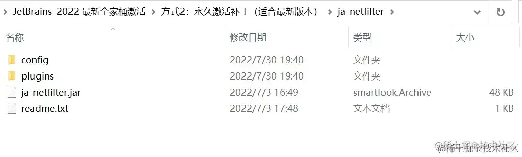 打开文件夹后,目录如下,ja-netfilter.jar 为激活补丁: