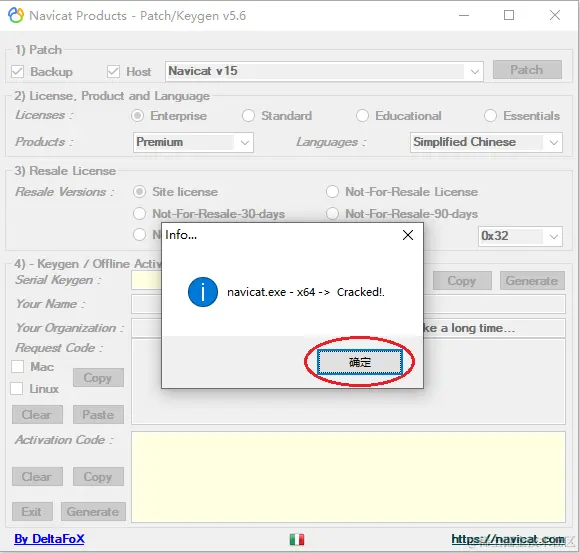 过一会就会有个navicat.exe – x64 -> Cracked!.的弹窗,点击“确定”