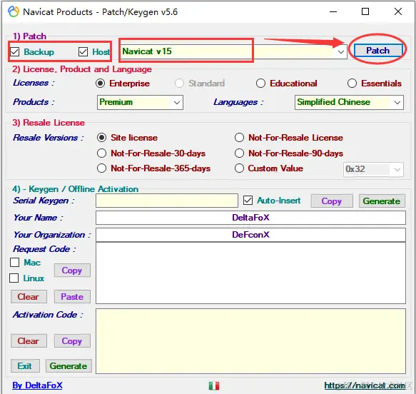 5.注册机打开后,Patch勾选Backup、Host,选择Navicat v15,然后点击Patch按钮