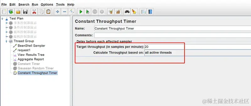 - 吞吐量定时器(Constant Throughput Timer):控制吞吐量/每分钟