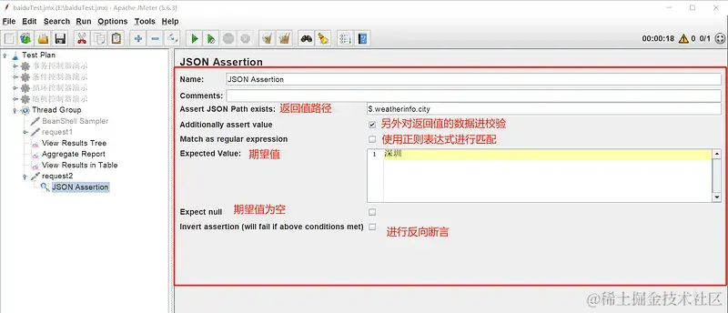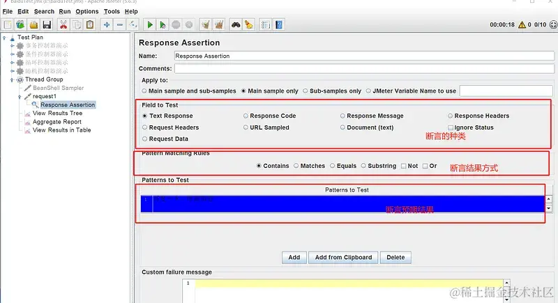 - 断言的作用就是让 JMeter 程序判断预期结果和实际结果是否一致,从而判定请求是否成功