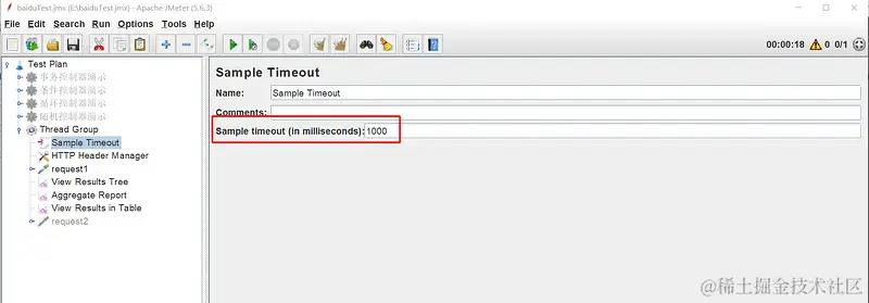 - Sample Timeout 前置处理器:设置请求的超时时间,作用范围内的请求均生效