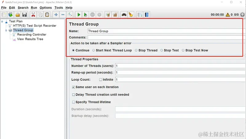 在请求取样器执行错误时需要执行的下一步动作