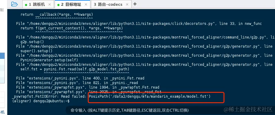 找不到model.fst,但是注意到怎么是在我数据集的目录下找这个呢,不是模型目录下?于是跟踪一下MFA这个命令的模型,在接收模型路径的地方输出一下日志