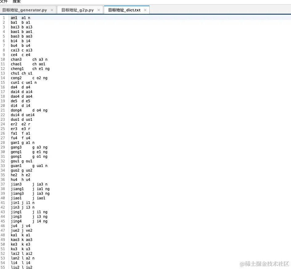 我们只需要提取第二行拼音,然后保存为.lab文件就行,可以参考如下脚本