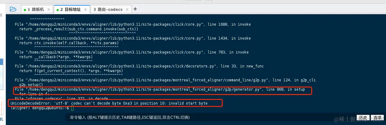 直接编码错误,难道模型或者数据集有不是UTF-8编码的文件,但是对比一下都是UTF-8,没有办法,参考网上怎么解决这种错误,然后改造MFA代码,使用codecs读取