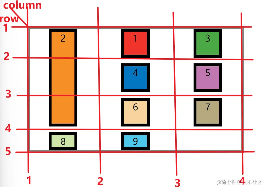 网格布局将容器分为“行”和“列”,然后产生单元格,项目则是处于单元格中。容器不包含项目之下的子元素。