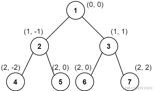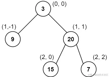对位于 (row, col) 的每个结点而言,其左右子结点分别位于 (row + 1, col - 1) 和 (row + 1, col + 1) 。树的根结点位于 (0, 0) 。